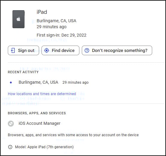 Next to each device listing is a > icon. This allow you to see more details regarding the device. Based on the device, you’ll see another screen with details. In some ways, it reminds me of seeing your Chrome browser history except that instead of seeing a page, we’re seeing device info. One feature I appreciate is this page tells me which Apple iPad model I have.
