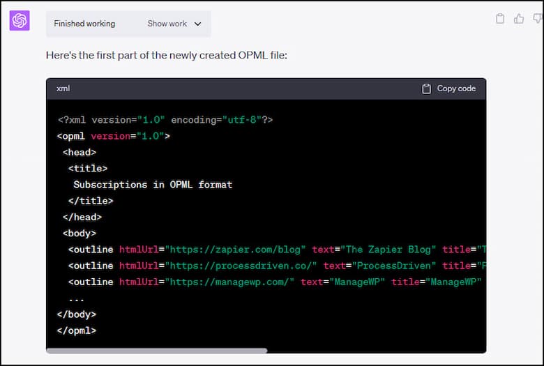 You can also use ChatGPT to create files for you. My Feedly file has quite a few entries. I’d have to manipulate the file if I needed to send someone just my WordPress feeds. And that assumes I know which ones are WordPress. Maybe I didn’t put them in the correct category, etc.