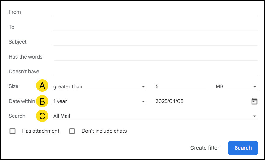 - In the pop-up dialog enter your search criteria. In this example, I want to find all emails within the past year that are greater than 5MB in size.